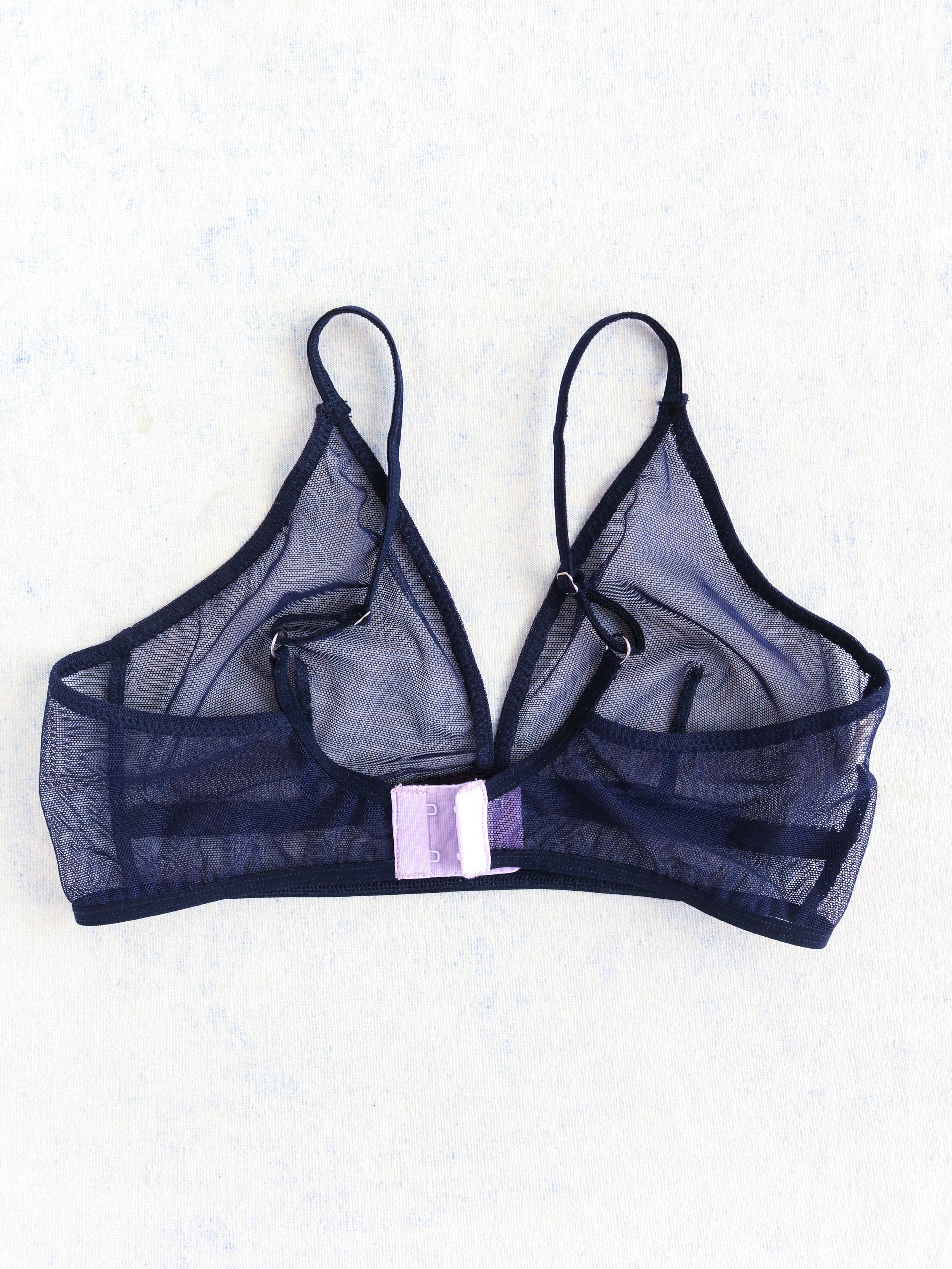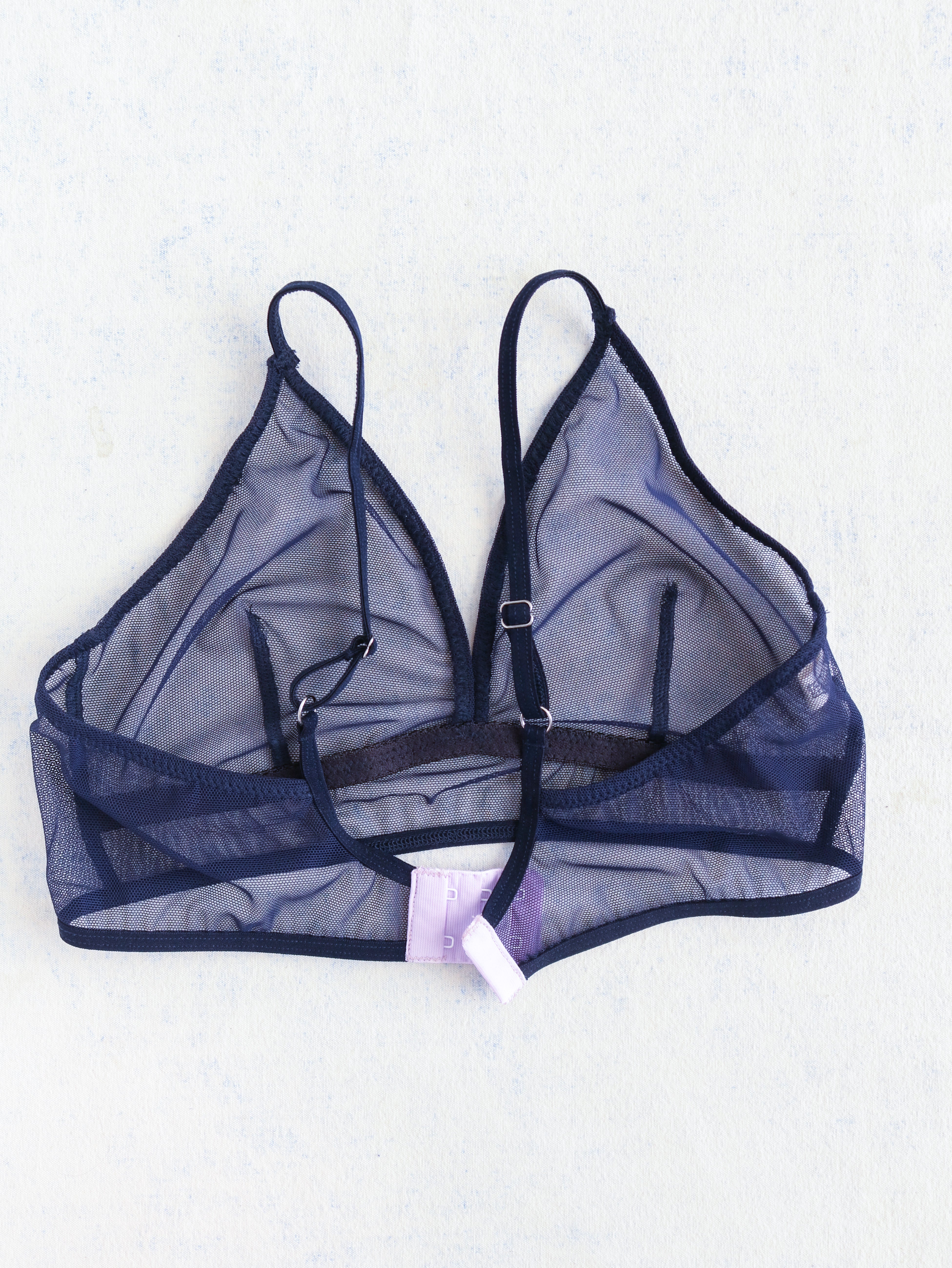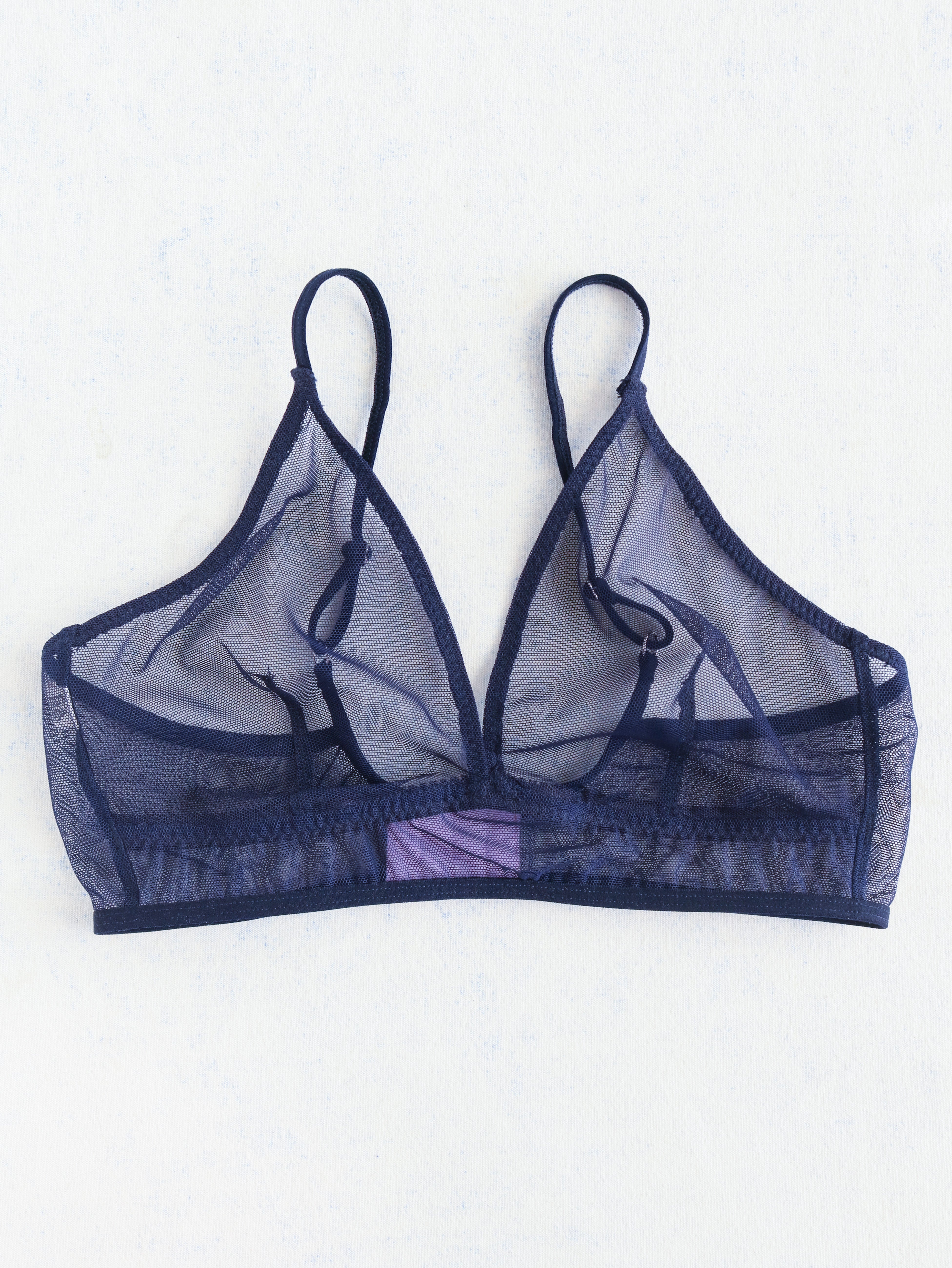 La bralette MIA est faite à 100% de tissus surcyclés. Orchidée est un mesh bleu en édition limitée. Elle sera réalisée suivant votre commande. Cette bralette propose un soutien moyen à élevé. Les bonnets sont non-doublés. Leur forme triangulaire entoure bien le sein et permet un décolleté.