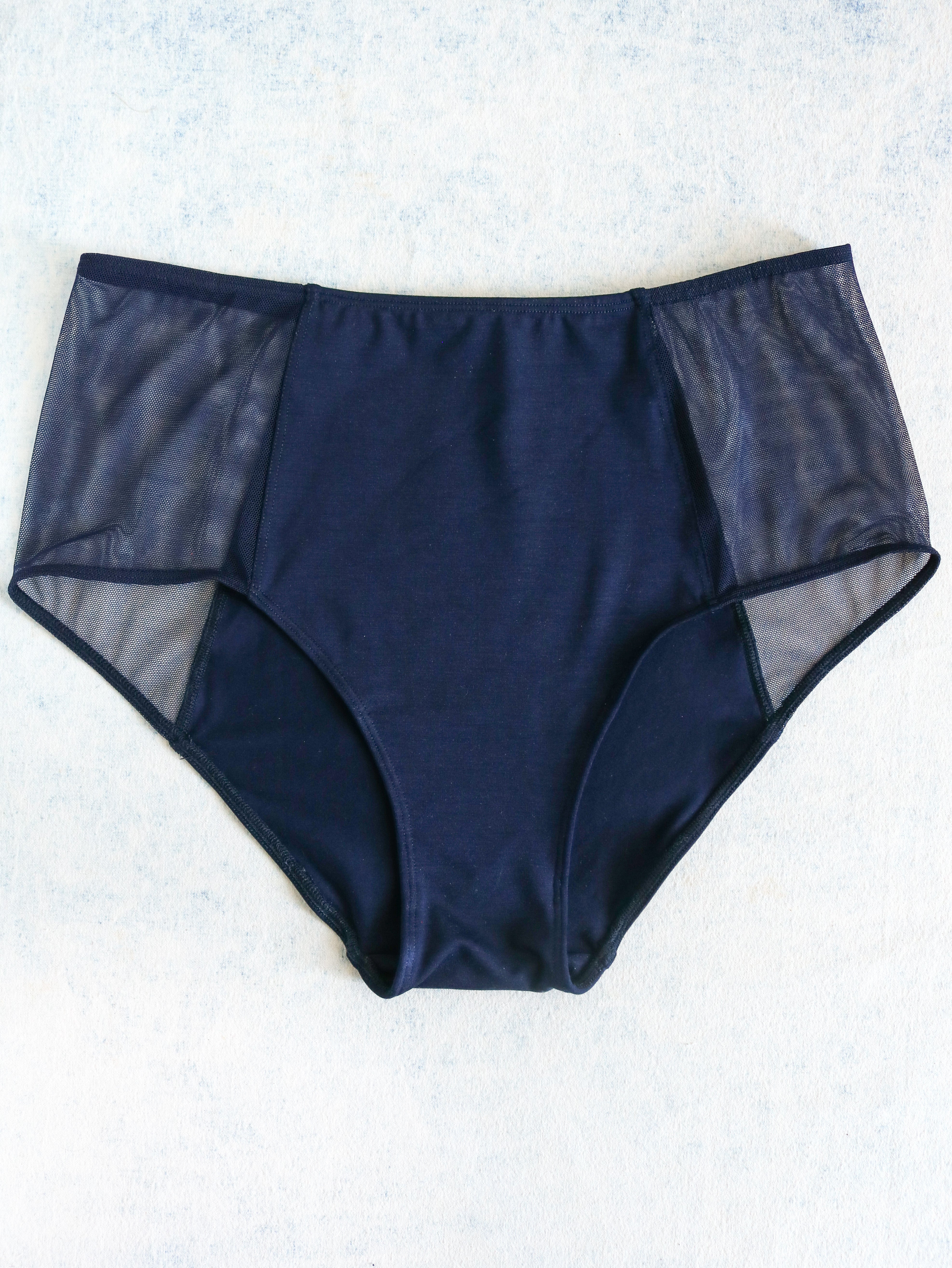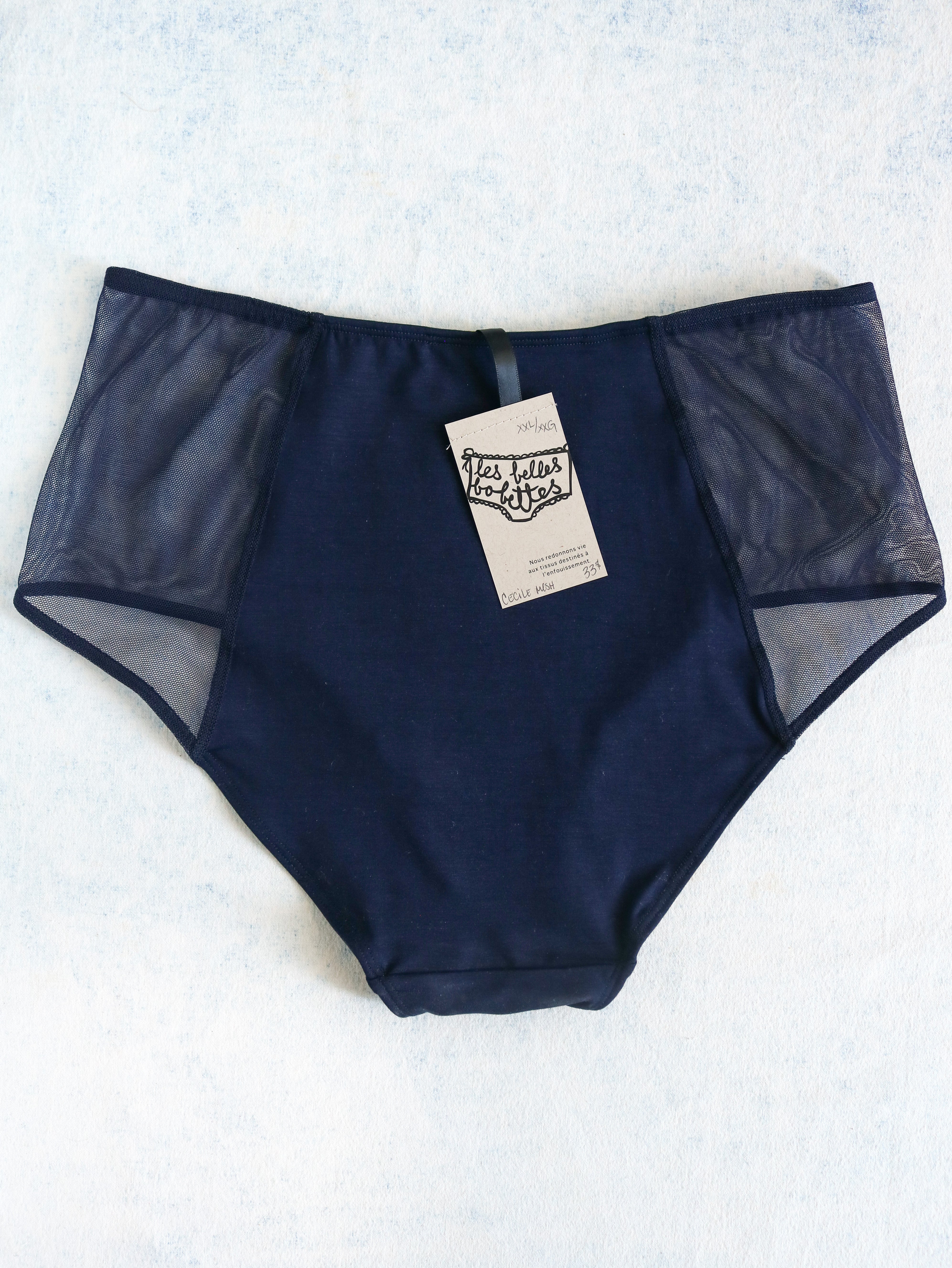 La culotte Cécile - Orchidée est faite à d'un tissu marine de modal ultra doux et absorbant et d'un mesh (résille) bleu de fin de ligne de haute qualité. Elle sera réalisée suivant votre commande.
